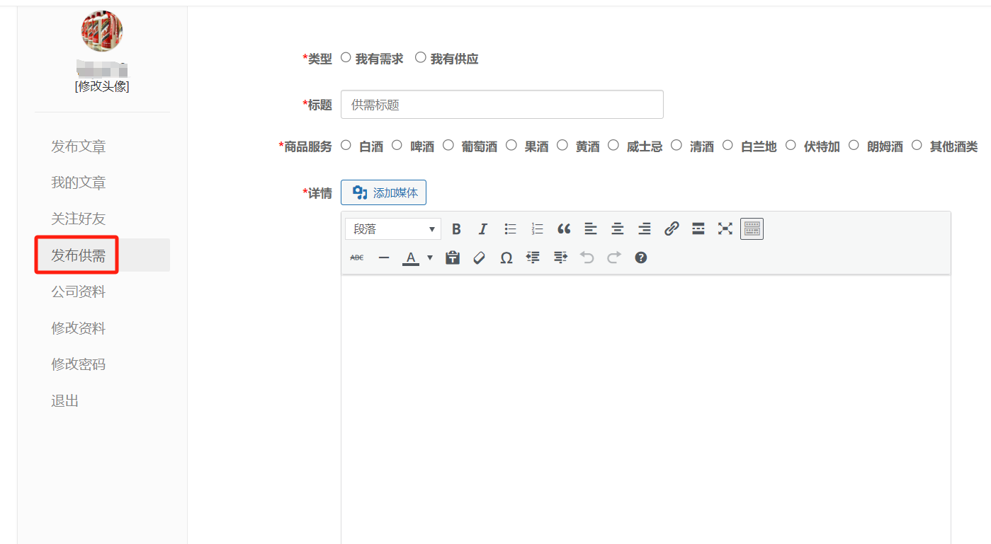 供求频道就是你有需求和供应信息都可以发出来,让能满足的酒业朋友看到,这就解决问题了。
