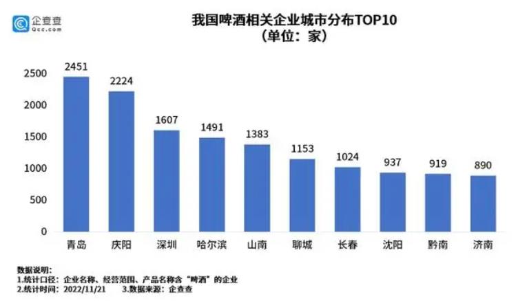 从城市分布来看,青岛现存2451家啤酒相关企业,位列第一;其次是甘肃省庆阳、深圳,分别现存2224家和1607家相关啤酒企业,位列第二、第三;此后依次为哈尔滨、山南、聊城等城市。