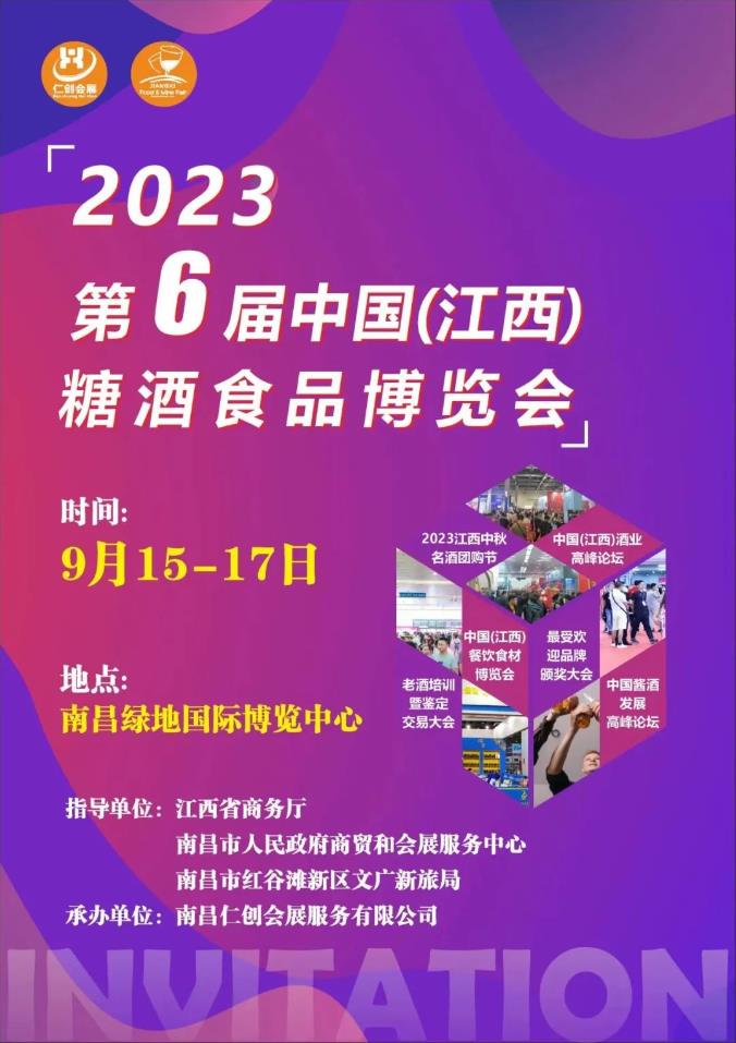 2023第六届中国(江西)糖酒食品博览会(简称江西将于2023年9月15-17日在南昌绿地国际博览中心举办。本届展会规划展览面积30000㎡,共设置了国产酒类综合展区、?进口葡萄腾博tengbo9885官网区、精酿啤腾博tengbo9885官网区、高端饮品展区、休闲食品展区等5大主题展区。?届时,600+优质展商,5000余款创新产品将同台亮相。展会深耕行业多年,展示产品覆盖酒食产业全品类,助力企业与买家共同进步。共享发展新机遇、共聚发展新动能、共启发展新征程!