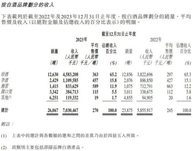 2023年,珍酒李渡实现营业收入70.3亿元,同比增长20.1%;经调整净利润16.23亿元,同比增长35.5%。旗下珍酒、李渡、湘窖、开口笑品牌,营业收入分别为45.83亿元、11.09亿元、8.33亿元、3.84亿元,同比增长19.9%、25.1%、17.0%、13.6%。珍酒李渡在财报中表示,按2023年收入计,珍酒为中国第四大酱香型白酒品牌,且珍酒贡献了珍酒李渡约65.2%的收入。