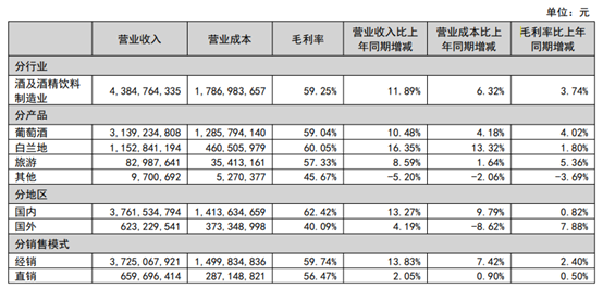 2023年,张裕的葡萄酒实现营业收入约31.39亿元,占总营收的71.59%,葡萄酒的毛利率为59.04%,同比增长4.02%。